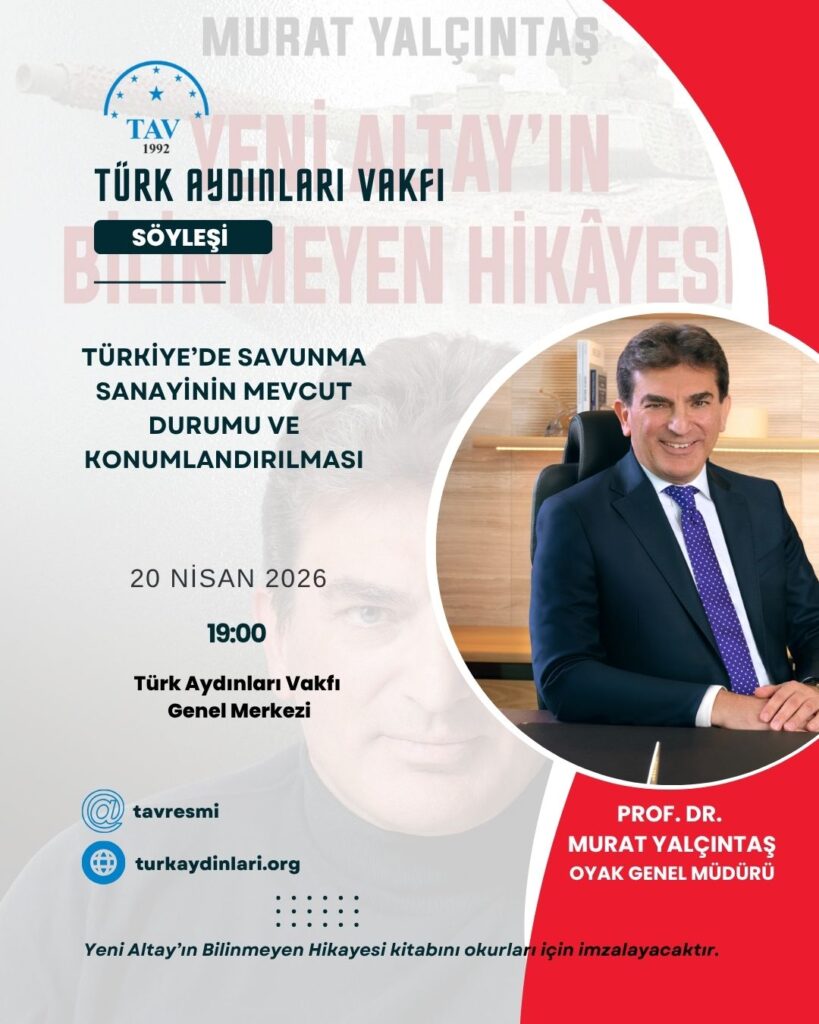 Türk Aydınları Vakfı olarak, Bilge Otağı toplantıları kapsamında Prof. Dr. Murat Yalçıntaş’ı vakfımızda ağırlıyoruz. Türkiye’nin savunma sanayiindeki mevcut durumunun, stratejik yönelişinin ve geleceğe dönük konumlanmasının ele alınacağı bu kıymetli söyleşi, 20 Nisan 2026 Pazartesi günü 19.00’da Türk Aydınları Vakfı Bilge Otağı Toplantı Salonu’nda gerçekleştirilecektir. Program sonunda Prof. Dr. Murat Yalçıntaş, son kitabı Yeni Altay’ın Bilinmeyen Hikayesi’ni okurları için […]