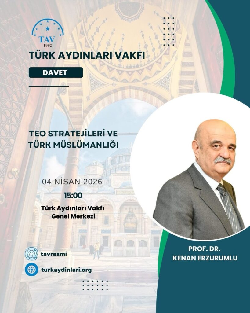 Vakfımız Genel Merkezinde, 4 Nisan 2026 Cumartesi günü saat 15.00’te Prof. Dr. Kenan Erzurumlu tarafından “Teo Stratejileri ve Türk Müslümanlığı” başlıklı bir konferans düzenlenecektir.
